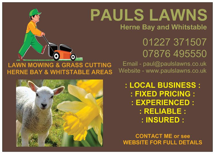 PAULS LAWNS : LAWN MOWING & GRASS CUTTING GARDENING SERVICE covering covering Herne Bay, Whitstable, Herne, Broomfield, Beltinge, Greenhill, Hampton, Studd Hill,Swalecliffe, Tankerton, Chestfield, Whitstable and surrounding areas
